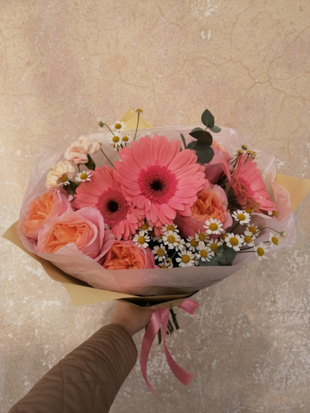 Букет из гербер (3), кустовых роз (2), гвоздик (1), зелени и танацетума (3).