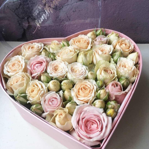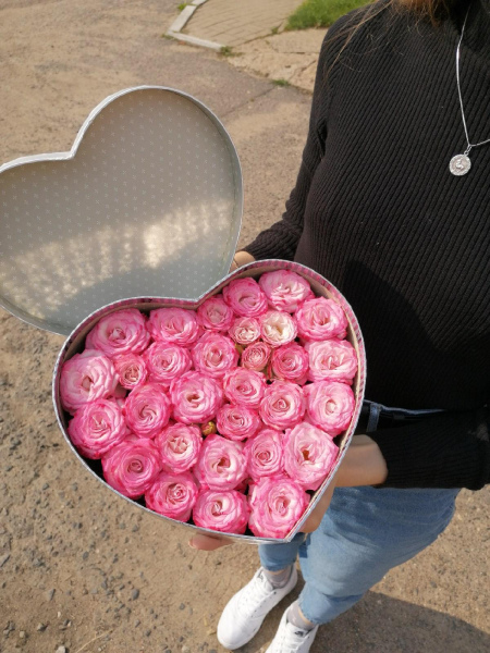 Коробка-сердце, наполненная кустовой розой любого оттенка, в зависимости от наличия на складе и пожеланий заказчика.