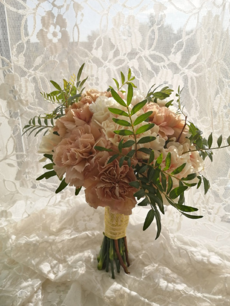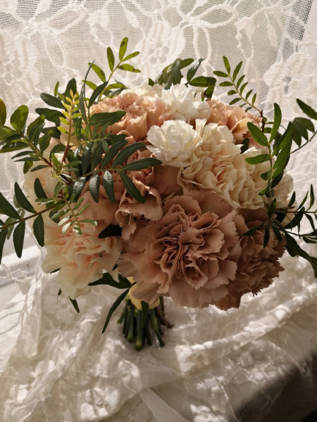 Букет невесты из гвоздик нескольких оттенков и веточек фисташки.