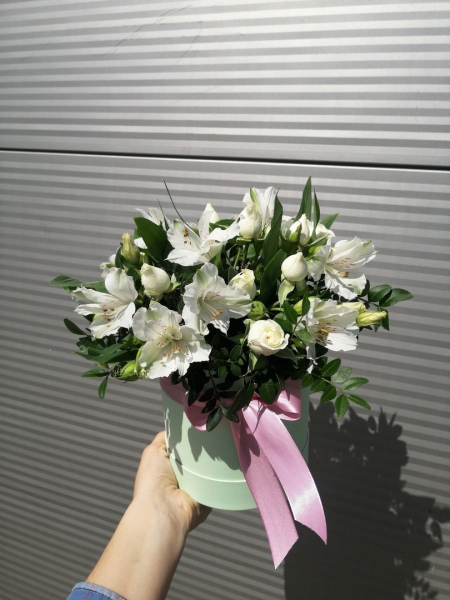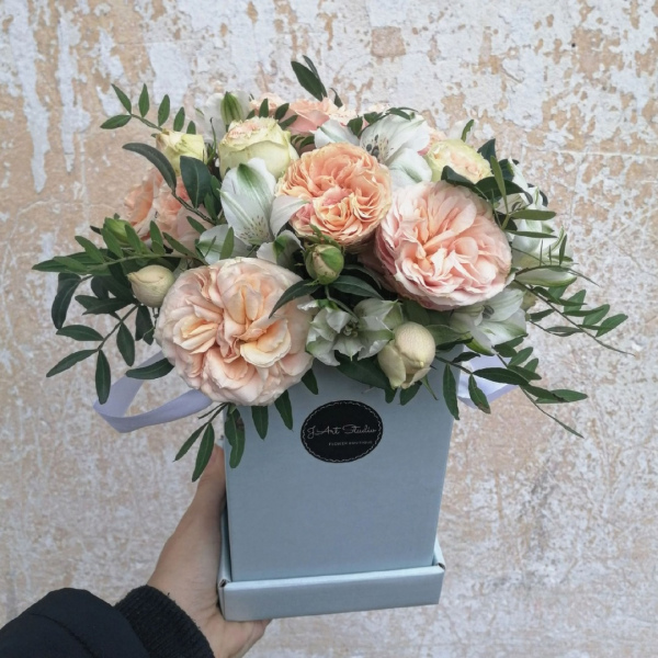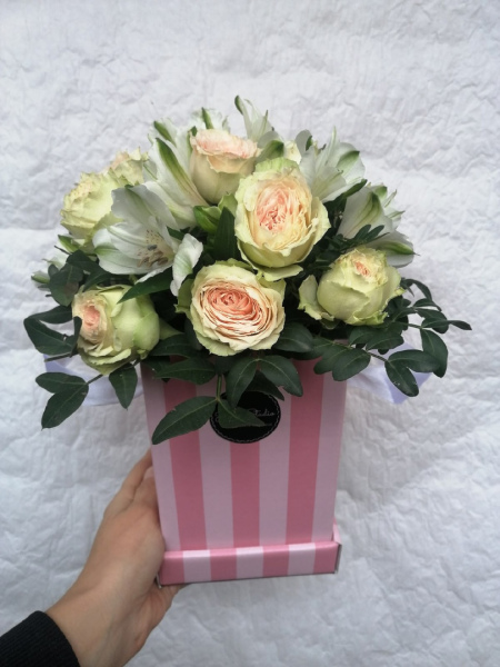 Коробка с кустовымии розами, зеленью и альстромериями.