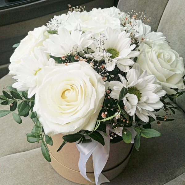 Коробка с розами, зеленью, ромашками и гипсофилой.