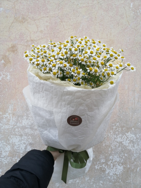 Букет из 9 веток танацетума в двухслойной упаковке.