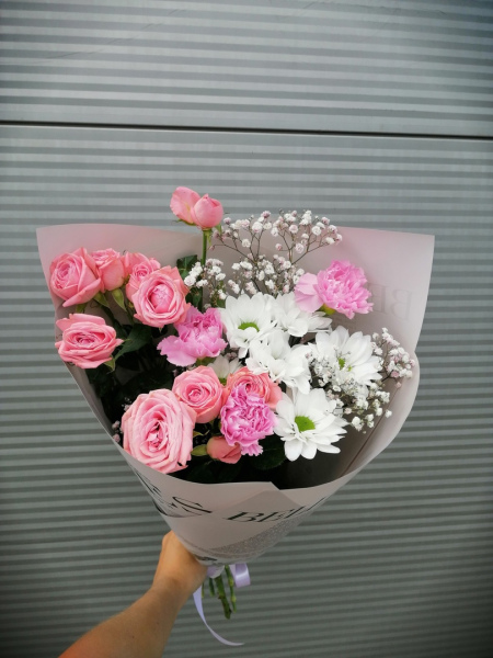 Букет с 1 кустовой розой, 1 хризантемой, 4 гвоздиками и 1 гипсофилой в упаковке.