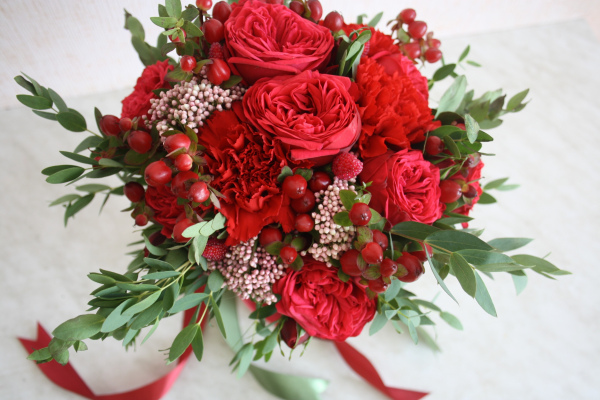 Все внимание с первого взгляда захватывает пионовидная роза Red Piano. Невероятной красоты сорт с тонким ароматом. Дополняет букет красная гвоздика, а розовый озотамнус слегка разбавляет его, слегка придерживая яркость и силу чувств, но лишь до той поры, пока не вдыхаешь свежий аромат парвифолии, свободно струящейся по букету.